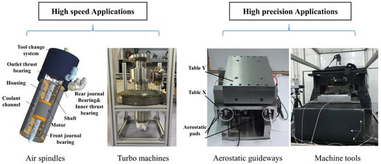 Aerostat thrust bearings are widely used in many fields. The typical applications are high-speed machinery, and high-precision applications, as shown in Figure 2. In high-speed applications, common applications are aerostatic spindles and turbo machines. For aerostatic spindles, a high rotational speed is required to maintain machine spindle speed [2,3]. Large load capacity is expected during the fly-cutter milling process. For turbomachines [4], more gas can be processed while running at high speed. In high-precision applications, common applications are precision machine tools, precision measuring equipment and lithography-associated production equipment [5,6]. Aerostatic guideways are applied to ensure precision linear motion with high repeatability and high resolution [7]. With the development of precision machining, the accuracy of motion is required to be higher, even at the sub-nanometer level [8]. Therefore, higher requirements are placed on the performance of ATBs, such as load-carrying capacity, stiffness, and stability. It is hoped to improve the stability of ATBs while still ensuring high static performance.