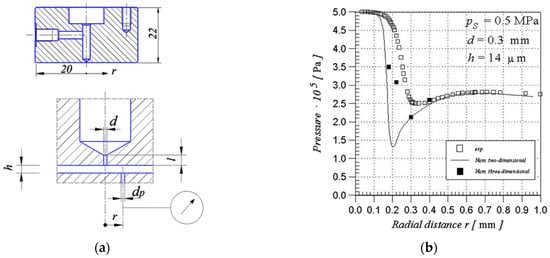 The first method is to connect the pressure sensor to the orifice to measure the pressure distribution in the gas film. The orifice is drilled on one of the pad’s surfaces [30,31]. This small hole is called the flow intake (dp = 0.2 mm) in the literature [32]. The detail of flow intake is shown in Figure 4a. The pressure distribution using this method shows a good agreement with the numerical simulation result, as shown in Figure 4b. However, the method of connecting the pressure sensor to the orifice plate still has some disadvantages. Firstly, non-negligible disturbances to the airflow in the thin gap appear and considerable measurement errors occur. In addition, the amount of experimental data obtained by this method is limited, both in terms of location and quantity. This method has been improved in the literature [33,34,35,36]. The supporting element has been replaced by a linear guideway with position control capability. More pressure data of bearing clearance can be obtained in one single experiment.