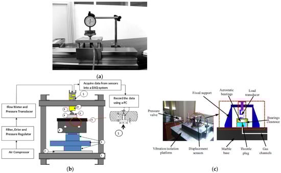 It is relatively difficult to test the load capacity of the bearing under moving conditions, especially at ultra-high speed. Therefore, most tests are currently carried out under static conditions. Vahdati, M. [38] applied different loads to the guideway. The film gaps in the X and Y directions were measured using an indicator clock, as shown in Figure 6a. Bhat, N. [39] adopted two pressure transducers to measure the load capacity, as shown in Figure 6b. Four displacement sensors were used to measure the gas film thickness between the bearing and the reaction plate. Similar to the method in the literature [39], Cui, H. L. measured the load capacity of the aerostatic thrust pad bearing using the load transducer, as shown in Figure 6c. The gas film thickness was measured by a displacement sensor (TESATRONONIC-TT80) [40].