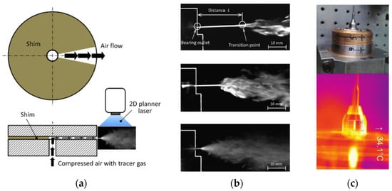 At present, many novel experimental techniques have been applied in the research of aerostatic bearings, especially visualization technology. Yoshimura, T. manufactured a visualization apparatus to investigate the flow behavior around the outlet of the bearings [42]. The test bench and visual flow results are shown in Figure 7a,b. The tracer gas was added to the feeding system and exhausted into the atmosphere. A 2D planar YAG laser and a high-speed digital camera were applied to observe the flow characteristics around the bearing outlet. The results showed that the flow around the bearing outlet turned into turbulence. The turbulence intensity was enhanced with a higher Reynolds number. This phenomenon provided strong evidence to explain the pressure fluctuation and nano-fluctuation of aerostatic bearings. To determine the performance of aerostatic spindles, Gao, S. Y. applied a thermal imager to measure the temperature of the shaft [2], as depicted in Figure 7c.