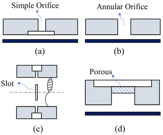 Various types of restrictors. (a) orifice restrictor (b) annular restrictor (c) slot restrictor (d) porous restrictor.