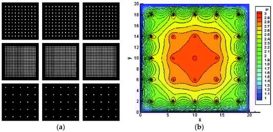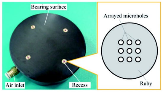 Aerostatic thrust bearings with micro holes show great potential in improving static performance. Fan, K. C. fabricated an aerostatic bearing using microfabrication technology [33]. The configuration of the several different forms is shown in Figure 9a, and the number of holes is 25,100 and 400, respectively. The surface pressure distribution of the bearing with 25 micro holes is shown in Figure 9b. The cross-sectional area of each micropore is 30 μm2. The gas film pressure is symmetrically distributed. The pressure in the central region is relatively high, showing a diamond distribution. Aerostatic thrust bearings with micro holes have a smooth and uniform pressure distribution. The load capacity has been greatly improved. Miyatake, M. [62] conducted research on small feed holes of less than 0.05 mm diameter with CFD and DFM models. The results indicated that higher stiffness could be obtained by adopting micro feed holes. Belforte, G. [63] investigated the static performance of ATBs with micro feed holes of less than 0.1 mm diameter. The results showed that the load capacity and stiffness of the aerostatic bearings can be optimized by modifying the number and diameter of aerostatic bearings. In order to reduce the nano-scale vibration of aerostatic bearings, Chen, X. D. [64] proposed a novel design scheme for an array micro hole restrictor (AMR). Different from the traditional orifice restrictor, the AMR had uniformly distributed micron-sized holes distributed in the form of arrays, so that the total restricted area was the same as the single-hole restrictor. For a more uniform aperture, AMRs were manufactured with laser drilling technology.