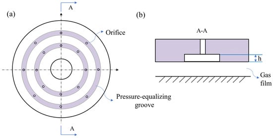 The static performance of the ATBs is not only closely related to the type of restrictor but also the surface structure. Scholars have found that the static performance of bearings can be improved by changing the surface profile of ATBs. Among these surface structures, the most widely used is the pressure-equalizing groove structure [67,68], as depicted in Figure 10. The studies of surface structures are introduced separately below.