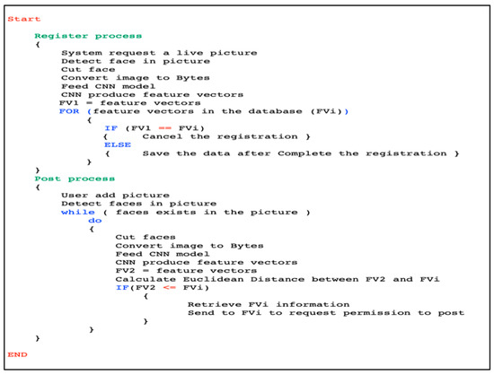 - Before publishing the photo, the seventh step (7) is to scan the uploaded photo to verify that there are no unauthorized people in the photo. This is done by using the previous Face-recognition Library in Python, the publishing process will be completed if the result of detecting the face is negative; if the opposite is proven (i.e., positive result), the process of detecting the faces of the people in the photo is done.