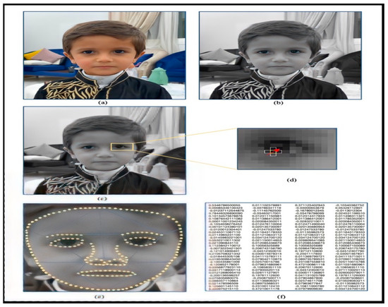 - The third step (3): our system detects and recognizes the face in the uploaded photos using Face-recognition Library in Python. We used the Google cloud platform as a local machine for run Python code. The Python code includes the basic operations of our application. We have two operations face detection in images and the face recognizing. Additionally, we used Google Cloud as a server for connecting the local machine with the flutter app. We can simplify this library’s work by proceeding as shown in Figure 3. The image is initially received Figure 3a and then converted to a black and white image Figure 3b. Each pixel of the image is watched and gradations of brightness in Figure 3c,d, that is from light to dark, are deduced for the whole image. Afterward, the pictures will be divided into small squares, each containing 16 × 16 pixels and color gradations will be calculated for each pixel in any direction, then replace the square with stronger pixel directions. At last, we will obtain a simple representation of the basic structure of the face as in Figure 3e.