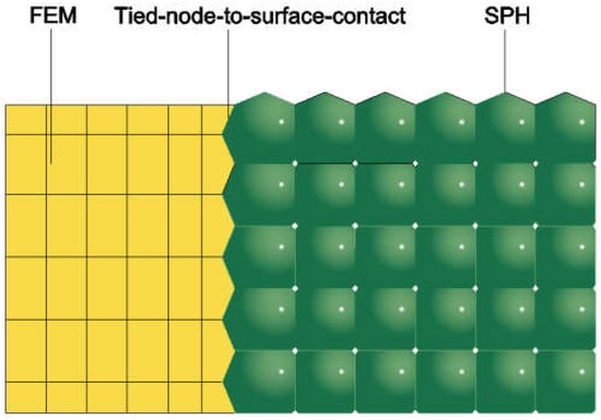 The key to coupling SPH with FEM is that the intersection can effectively transfer SPH particle information to the finite element mesh. The common method is to set up interfacial contacts to bond the SPH particles to the finite element mesh to achieve displacement coordination between the two methods in a point–surface glued contact. The contact parameters are adjusted by setting the keyword *CONTROL_CONTACT. The contact schematic is shown in Figure 2.