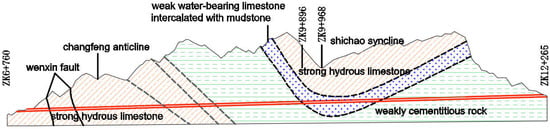 The Dejiang tunnel referred to in this study is located in Tongren City, Guizhou Province. It is a separate super-long tunnel with a total length of 5500 m. The surrounding rocks are moderately weathered argillaceous siltstone, limestone, mudstone, and mudstone intercalated with argillaceous limestone. The rock mass is developed with joints and fissures, and the rock mass is relatively broken, showing a mosaic-fragmented structure. The Dejiang tunnel approximately traverses the Wenxin fault, the Changfeng anticline, and the Shixiang line in an approximately orthogonal manner, as shown in Figure 3. Among them, an inclined karst catchment spanning 1050 m across the rock-facing area has been constructed for the water-rich karst section. According to the hydrogeological survey, the catchment area is 29.6 km2. At the same time, because the rock faces the oblique catchment and the bottom limestone blocks the bottom water, a huge underground river system is formed above the tunnel.