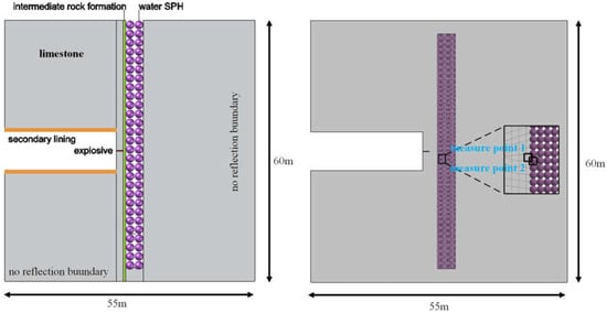 The model is a single layer grid model with a length of 55 m and a height of 60 m. The explosive is located in the center of the upper step of the tunnel and is 4 cm in diameter and 1.5 m in length. The aquifer in front of the palm face is divided by SPH particles, with a thickness of 4 m and a head height of 34 m. The rest of the model is meshed with a finite element mesh. Normal constraints and reflection-free boundaries are set at the bottom and left and right of the model, and the top of the model is free. Gravitational interaction is defined by the *LOAD_BODY keyword. SPH-FEM contact is achieved by setting *CONTROL_CONTACT to enable SPH-FEM interaction. The parameters contained in *CONTROL_CONTACT are shown in Table 1.