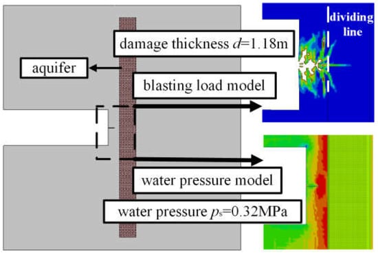 Based on the above model parameters, for a rock wall thickness of d = 1.2 m, separate models for blast load only (no aquifer) and water pressure only (no blast load) were developed to investigate the separate effects of blast load and aquifer water pressure on the rock wall. As can be seen from Figure 7, in the original, aquifer material is dispersed into the surrounding rock conditions, and the blast cracking generated by the blast load on the rock wall caused blast damage with a depth of d = 1.18 m. While the width of the rock wall is 1.2 m, the damaged area does not extend to the aquifer location, which indicates that, although the blast load alone caused damage cracking on the rock wall, albeit in the absence of water pressure, it did not directly cause a water inrush in the tunnel. In addition, the stress cloud diagram under separate water pressure shows that the rock wall did not crack under water pressure, although the stress concentration at the bottom of the blast is obvious and there is a high stress area with a peak stress of PS = 0.32 MPa. When the rock wall cracks due to the damage caused by blasting loads, the end of the resulting crack is close to reaching the stress concentration area at the bottom of the blast hole, in which case a stress release is likely to occur. This will likely result in a stress release, causing the damage fissure to penetrate the aquifer and cause water inrush in the tunnel. In the karst tunnel drilling and blasting construction process, the blasting load will be coupled with karst water pressure, and it is necessary to study the blasting load and karst water pressure coupling under the karst tunnel surge water mechanism.