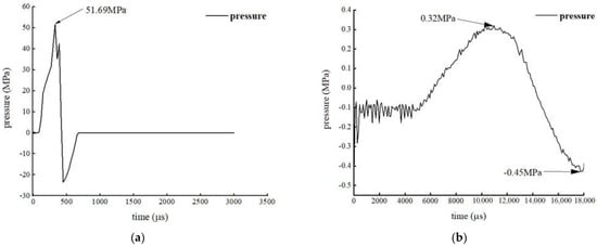 Stress−time curve at measurement point #1 under blast load and water pressure: (a) Stress−time curve at measurement point #1 under blast load. (b) Stress−time curve at measurement point #1 under water pressure.