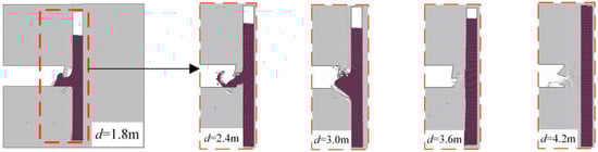 In order to study the effect of rock wall thickness d on tunnel water inrush under blasting conditions, d was set to 0.6 m, 1.2 m, 1.8 m, 2.4 m, 3.0 m, 3.6 m, 4.2 m, and 4.8 m for the modeling analysis. The calculation model is shown in Figure 6. The calculated working conditions are shown in Table 7.