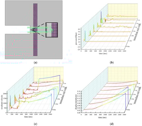 Model data analysis of different rock wall widths: (a) Illustration of measurement points. (b) Finite element unit stress diagram for measurement point #1. (c) Vibrational velocity diagram of measurement point #2. (d) Displacement diagram for measurement point #2.