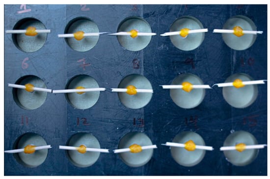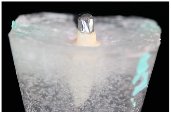 Resin luting cement, Rely X Unicem resin cement (3M ESPE; Seefeld, Germany), was used to cement all post and cores. The cement was mixed according to the manufacturer’s instructions and was coated on the post. Cement was also applied into the root canals by attaching an elongation tip to the nozzle. After that, posts were gently inserted into the root canals to reduce the hydrostatic pressure; they were positioned in place under firm finger pressure, and excess cement was removed (Figure 6). Then, specimens of each group (n = 20) were kept in normal saline for 24 h in a refrigerator before testing. Thermocycling (Thermocycling test apparatus; Durant) was performed for all specimens in 2 water tanks (cold, warm) by immersion at the temperatures of 5 °C and 55 °C and fixed time intervals (16 s cold, 16 s warm) for a total of 6000 cycles, which represented 7 months of clinical use [41].