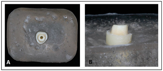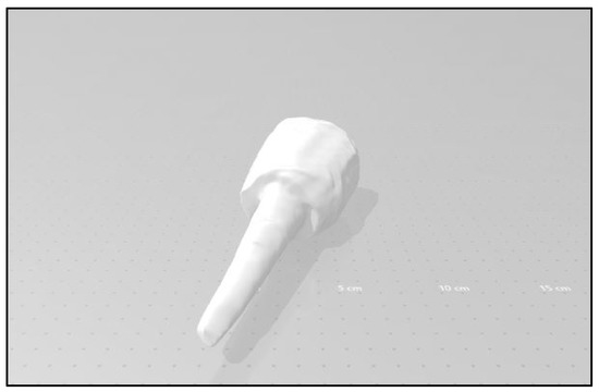 Teeth were individually mounted in a special specimen holder using epoxy resin (Exakto-form; Bredent, Derbyshire, UK) (with an elastic modulus of 12 GPa, which is similar to the elastic modulus of human bone (18 GPa)) [29] with the use of a test mount former of 2 cm3 in dimension 2–3 mm below the cementoenamel junction (CEJ). A prefabricated jig was used to position each tooth in the test mount former during the immersion of the tooth in acrylic resin to standardize the tooth position to be centralized within the test mounts. The test mount jig was used to standardize the tooth position while performing tooth preparation and RCT (Figure 1). To avoid the dehydration of natural teeth due to the heat generated during the polymerization of acrylic resin, the resin block was cooled in water [30]. The teeth were prepared to have a 2 mm ferrule and a 1 mm shoulder finish line (Figure 2) [31,32,33].