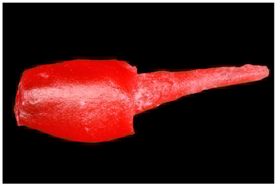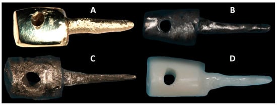 Custom-cast post and cores (CCPCs) have been reported to have superior adaptation and fit the radicular post-space walls when compared with prefabricated posts [3,4]. Compared with other post-and-core systems, CCPCs are advantageous, as they exhibit higher resistance to rotational movement forces [5], have a superior success rate [6,7], and have better retrievability for endodontic re-treatment [6,8]. Various materials can be used for fabricating custom post and cores. These include gold alloys [9,10,11], titanium alloy [9,11], base-metal alloys [9,12,13,14], zirconium oxide [11,15,16], glass fiber-reinforced composites [11,17], etc., which can be fabricated by different techniques such as casting [9,10,11,12,13], CAD/CAM milling [11,12,15,16,17], and 3D printing [11,12,14]. Various alloys are used for the fabrication of CCPCs, and most of them exhibit good retention and fracture strength [18,19]. However, CCPCs have been associated with catastrophic abutment fractures due to their high stiffness [4,5].
