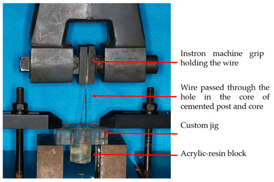 To standardize the location and direction of the specimens in the machine, samples were placed in a custom-made, self-aligning device. A hook-shaped attachment was passed through the hole created in the custom post and core, which was attached to the Instron testing machine (ITM). The acrylic-resin blocks held the teeth securely during retention testing (Figure 7). Force was applied until the cemented post was removed from the prepared post space. The retention values were recorded as the amount of force required to dislodge the post and core from the prepared post space [30]. Test specimens were considered to have failed when the post and core separated from the tooth.