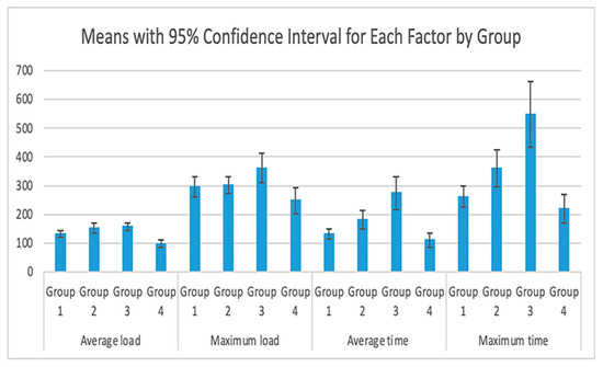 Descriptive statistics are given as means with 95% confidence intervals (CIs) for the variables of maximum total time, average total time, average load, and maximum load for each group (Table 2).