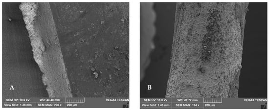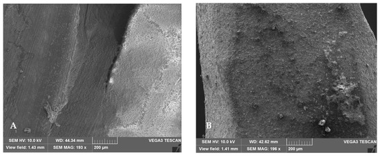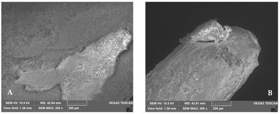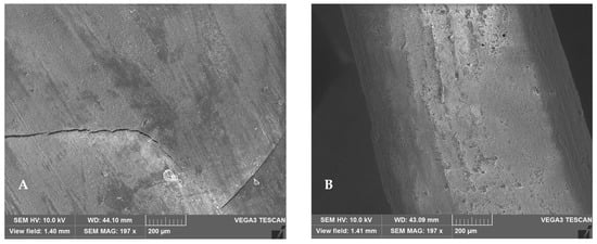 The failure mode varied between the groups, according to the scanning-electron-microscopy images. The majority of failures for all tested custom post-and-core systems were cohesive failures, except for Group 4, which revealed a mixed type of failure, as shown in Figure 9, Figure 10, Figure 11 and Figure 12.