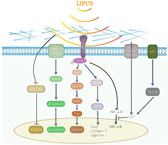 Low-intensity pulsed ultrasound (LIPUS) is a non-invasive acoustic radiation generally acknowledge to play a significant role in osteogenesis [1]. The intensity of LIPUS ranges from 30 mW/cm2 to 100 mW/cm2. LIPUS shows mechanical vibrations at frequencies above the detection limit of human sound [2]. For avoiding tissue overheating, frequencies of 1~3 MHz and intensity of 30~90 mW/cm2 for 5~30 min/day were often adopted in previous studies [3]. Interestingly, LIPUS appears to have diverse optimal parameters in different tissues and there is still no unified usage specification of LIPUS at present. According to the low-intensity and pulsed pattern, LIPUS not only has the lowest heating effect, but also contributes to transmitting sound waves into specific areas [4]. The pressure waves can serve as mechanical stimulation and activate downstream signals through signal transduction [5]. At present, it’s universally acknowledged that the signal transduction is stimulated due to the influence of mechanical stress and/or fluid micro-streaming on the cellular plasma membrane, focal adhesion, and cytoskeletal structures [6,7]. Integrin was found able to serve as the mechanoreceptor on the cell membrane and conduct mechanical stimulation into cells [8]. When integrin was stimulated by LIPUS signals, the adhesions of focal adhesion adaptor proteins were enhanced. Then, the focal adhesion kinase (FAK) was phosphorylated and promoted signal transduction [9]. After that, the mechanical signal was transformed into electrical or biological signals and then contributed to various biological processes, such as osteogenic differentiation, bone healing, cytokine secretion, and angiogenesis [10,11,12]. Besides, LIPUS has been implicated to reduce the inflammatory response and mediate tissue regeneration through various signal pathways (Figure 1).