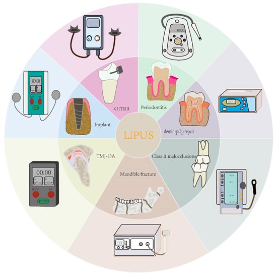 As for dentistry, oral diseases have influenced a massive number of humans worldwide. In recent years, LIPUS had emerged as a burgeoning therapy in oral diseases and made great advances. The applications of LIPUS in the dental field mainly concentrate on periodontal regeneration, alveolar bone healing, orthodontic bone remodeling, temporomandibular joint cartilage regeneration, and dentin-pulp repair [13,14,15] (Figure 2). In this review, we integrally elaborated on the clinical application progress and the specific mechanisms of LIPUS in dentistry and expound on the application prospect of LIPUS. In fact, a review concerning recent advances of LIPUS in dentistry for the past five years is lacking. Thus, this summary may bring new insights into the current research state of LIPUS. Furthermore, we systematically concluded the targets, parameters, and effects of LIPUS in various oral diseases. The limitations and study defects of LIPUS were also set forth. Overall, this paper aims to provide direction for future research on LIPUS in dentistry, find the usage specification of LIPUS to apply this tool more securely and more effectively, and broaden the treatment thoughts for oral diseases.