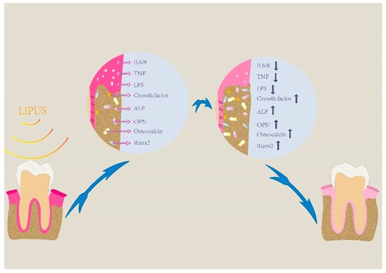 LIPUS plays a dual role in periodontitis. By applying LIPUS, inflammatory factors including IL-6, IL-8, TNF decrease while osteogenesis-related factors increase. Therefore, the inflammatory response and alveolar resorption of periodontitis can be significantly improved.