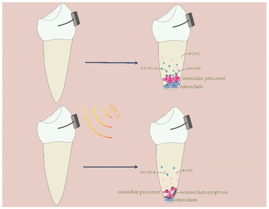 OITRR usually occurs in orthodontic treatment as a side effect [62]. A study showed that almost all patients and 55%~91% teeth occurred root resorption during orthodontic treatment [63]. However, OITRR has few clinical symptoms and a clinically available approach for treating OITRR has not been discovered. So as OITRR is examined, it’s often severe [64]. Under most circumstances, only the surface layers of cementum are assimilated and then repaired by cementoblasts during OTM. Once the repair ability of the cementum was suppressed, apical root resorption becomes worse [65]. LIPUS was proven to impose restrictions on OITRR. Applying LIPUS 20 min/day in beagle dogs that received OTM, cementum in premolars near the apex became thick, indicating the potential of LIPUS in reducing OITRR [66]. In beagle dogs, the LIPUS inhibiting effect of resorption in the middle and the apical thirds of the root was prominent [67]. Similarly, in rats, the number of osteoclasts, resorption lacunae, and resorption area ratio in the group with LIPUS stimulation were all lower than in the group only with orthodontic appliances [68]. Concerning the mechanism of LIPUS inhibiting OTIRR, one of the most acknowledged viewpoints is that OPG and RANKL play an important role. RANKL can combine with its receptor RANK on the surface of osteoclast precursors and then promoted the growths and differentiations of osteoclasts [69]. OPG is an inhibitor of RANKL which can reduce the absorption of alveolar bone and promote the apoptosis of osteoclast [70]. However, studies discovered that LIPUS contributed to bone repair and remodeling through increasing the proportion of OPG/RANKL (Figure 5). The increased OPG/RANKL enhanced the ability to inhibit osteoclasts and then reduce the destruction of cementum, thereby suppressing OITRR [62,68]. In addition to LIPUS, photobiomodulation (PBM) also has an effect on OITRR. Actually, a control experiment manifested that the function of LIPUS and PBM in OITRR had no significant difference [68]. However, at present, research on the combination of LIPUS and PBM in OITRR is limited. More control experiments are needed to explore whether the cooperation of LIPUS and PBM is more efficient in OITRR.