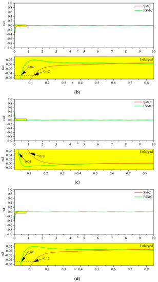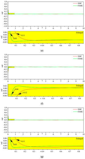Figure 4 shows the simulation results corresponding to the actuator constant deviation fault. It is easy to know from Figure 3a,b and Figure 4a,b that the vibration disappears under CDF. It can be interpreted that the constant offset fault does not change during the whole process, which is not similar with CGF, so the effect of CDF at steady state is minor. We also know from Figure 4a–f that the regulation time for both SMC and FSMC under CDF remains unchanged. Additionally, the steady-state error, if given adequate time, reaches zero, but the FSMC has the priority in the rapidity. The priority can be due to the fractional operator, in which the integration calculation can speed up the converging process.