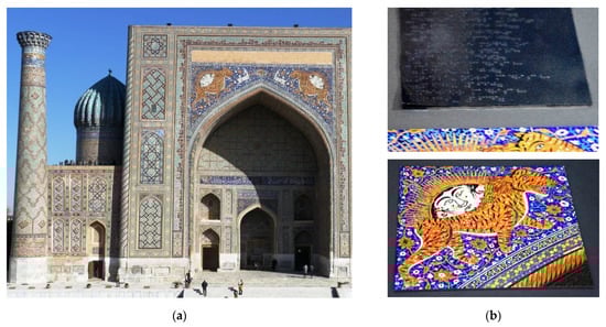 For many people, a visit to a museum can make them feel left out. The traditional display of museum items in glass cases behind glass, despite the information written in Braille, is completely insufficient for the blind or visually impaired person (light reflections significantly impede the observation of the object). The authors encountered such examples in places inscribed on the UNESCO World Heritage List, e.g., in the Shahrisabz Museum of History and Material Culture (Shahrisabz, Uzbekistan), or a museum created in the area of Greco-Roman excavations in Nea Paphos (Cyprus). A much better solution for exposing exhibits to the blind can be found in the museum of Registan (Samarkand, Uzbekistan). The object is a fragment of the famous mosaics on the front of the Sher-Dor Madrasah ivan showing lions, gazelles and the sun, as seen in Figure 1a. The exhibit for the blind is a miniature whose surface has a different texture depending on which object it represents. This solution allows one to feel the outline and shape of individual objects. The facility for the blind is also enriched with an additional description in Braille placed next to the exhibit, as seen in Figure 1b.