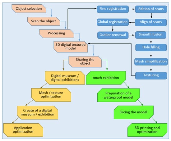 The procedures for making museum objects available are quite complicated, which is why they are presented in the form of a diagram in Figure 2. The diagram shows the developed procedure that allows for the presentation of museum objects in various forms: digital and real copies. The proposed procedure uses 3D scanning technology to obtain digital data about objects and transform them into digital 3D models along with the texturing process. For several years, the authors have been using the 3D scanning technology of museum objects both to protect cultural property and cultural heritage, and to make it available [34,35].