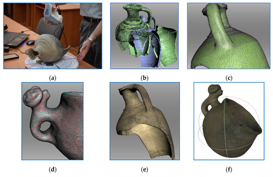 View of: (a) the scanning process; (b) data processing from the scanning; (c,d) the 3D mesh model; (e,f) the textured 3D mesh model.