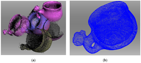 The scanning of the objects in Figure 3 was carried out in in situ conditions. For data acquisition during scanning, a software dedicated to the Artec Studio Professional scanner and a laptop with a 4-core Intel Core i5 processor and 16 GB of RAM were used. Eight scans were made for the jug-type object. This allowed for the precise acquisition of data about the facility. The data file in the form of a point cloud was approx. 5 GB in size. Six scans were taken for the mug and a 1.35 GB file was obtained. The processing of the obtained data was carried out according to the procedure presented in Figure 4. The same software as for data acquisition was used—Artec Studio Professional, as seen in Figure 4b–d.