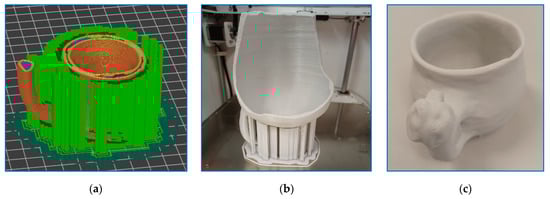 View of the objects: (a) layered model of the jug ready for printing (25% of the height); (b) a printed replica of the jug with supports; (c) a printed mug after cleaning it off supports.
