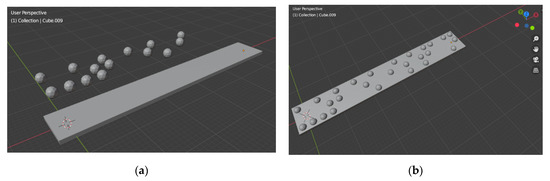 Preview of text preparation in Blender—Stage B: (a) creating inscriptions in Braille; (b) modelling tiles with text in Braille (the text in Polish—Uzbekistan, in ang. Uzbekistan).