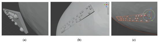 Preview of inserting inscriptions into the surface of the object in Blender—Stage D: (a) placing the inscription above the surface, (b) introducing the inscription into the surface of the object, (c) merging the objects into a whole—Stage E.