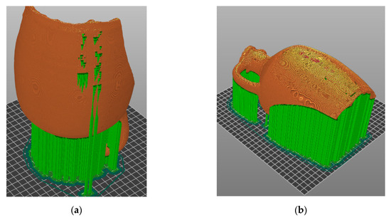 In the first stage of the works (Figure 2), the activities were related to the preparation of the so-called digital waterproof models, because only such models can be directed to 3D printing. The post-processing performed allowed for the closing of all surfaces and the removal of unnecessary edges and protruding surfaces. This task was performed with the use of 3D models generated in the previous stages, saved in the .obj format, and a set of tools for the free Blender program called 3D-Print Toolbox. 3D-Print Toolbox has specialised tools designed to identify surface geometry errors that may cause problems in the printing process. The watertight models prepared (using the “Slicer” type program) were transformed into layered models (Figure 6a) and supports were added in the required places. In order to ensure the stiffness of the object, a filling of the “grid” type was used. The printing parameters shown in Table 2 were adopted for both models. Wall Line Count was set to 3 to improve the quality of the outer surface to be touched. In order to verify the effect of the height of the layers on the roughness of the surfaces palpable by visually impaired persons, the thickness of the layer was 0.12 mm for the mug and 0.25 for the jug.