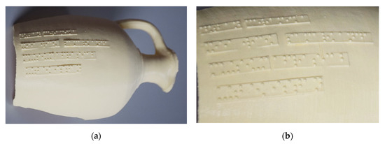 Due to the length of the 1:1 scale printing process of the jug, it was decided to use a version of the model representing 80% of its actual size. Printing time was reduced to approximately 70 h. For the pilot study, the inscriptions in the following lines were scaled to verify whether the use of 3D printing with FFF technology with the selected printing parameters (Table 1) would not introduce some inaccuracies that would make it impossible for a blind person to read the words, as seen in Figure 11.