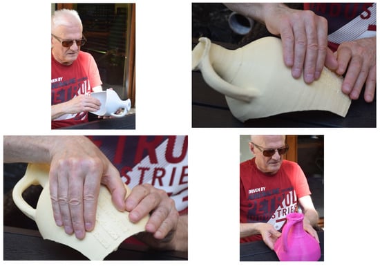 The 1:1 scale was used to print the mug model, while for the jug the 1:2 and 1:1 scales were chosen. Three-dimensional printing was performed on a Makerbot replicator Z18 printer (Figure 6b), by using PLA-type plastic with a diameter of 1.75 mm. Printing the mug took 26 h, and 122 g (41 m) of material was used. Printing the jug in the 1:2 scale took 25 h, using 200 g (68 m running) of plastic, and in the 1:1 scale printing took 102 h (over 820 g of plastic with a wire length of almost 250 m were used). Finally, the printed models were cleaned off the supports (Figure 6c).