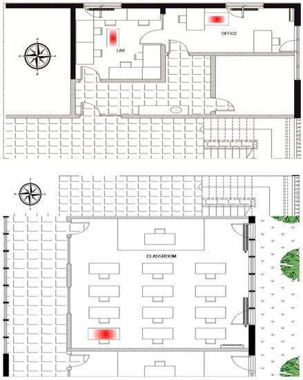 Floor plans of the Office, the computer center (Lab), and the small lecture room; the red rectangle is the location of the monitoring station.