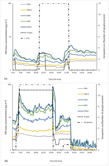 Next, the MS was transported in the middle of the Lab. In this case, the door between the two rooms was kept close. The effect of the operation of the PCs on IAQ in the Lab (as well in the Office) was examined with and without human presence. Figure 2b presents the indoor PM mass concentrations along with the number of people present and the number of operating PCs before, during, and after the practical training of the students.
