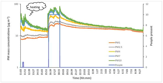 Figure 3 presents an example of the diurnal variation of the PM mass concentration inside the classroom during March 2022. Owing to the COVID-19 pandemic, the number of students that can attend each lecture was restricted to ten, but the room can hold forty persons. On this day, the researcher entered the class at 11:00 and a lecture was held from 16:00 to 19:00 with 10 students present.