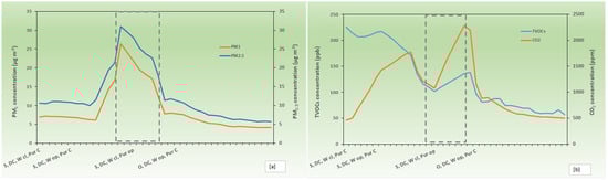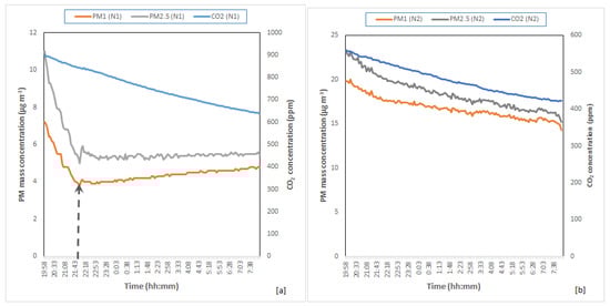 During this Campaign 1, a strong north wind cleared the atmosphere outdoors. Hence, the outdoor concentrations of all of the atmospheric pollutants were low []. Indoors, the PM mass concentrations were also low when the rooms were empty. People’s presence, movement, and activity increased the PM concentrations indoors, as depicted in Figure 2a,b.