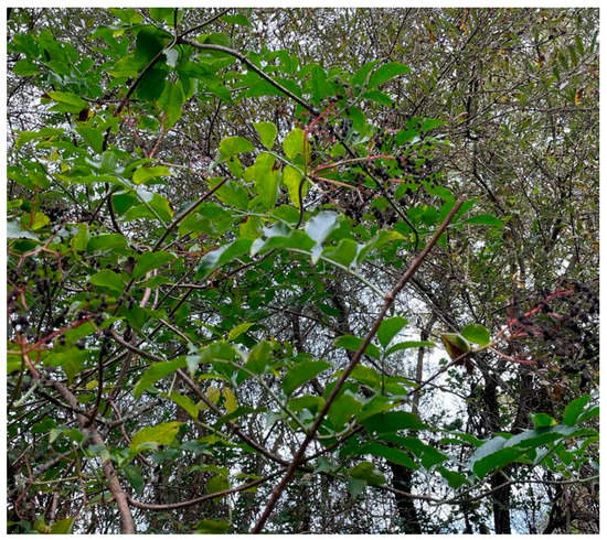 Sambucus nigra L. fruits were collected in mid-September 2019 in Braganza, Portugal, when the maturation process was complete (Figure 1). The harvested fruits were immediately separated from the stems, washed, and frozen at −20 °C. The frozen fruits were crushed using a knife mill (model A327R1, Moulinex, Madrid, Spain) with a small amount of water to obtain juice; this process was facilitated by the previous freezing of the fruits, and later centrifuging them (K24OR refrigerated centrifuge, Centurion, West Sussex, UK) to separate the husks and small seeds. The supernatant obtained was frozen, lyophilized, reduced to a fine, dried powder (35 mesh), and stored for further analysis.