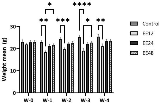 This study lasted for 29 days, during which almost no alteration was observed regarding the murinometric parameters evaluated. However, animals from EE12 (p = 0.012) lost a significant amount of body weight when compared with the control group (in weeks 1–4) and EE48 (in weeks 1 and 3), whereas animals from EE24 and EE48 did not show any significant differences when compared with the control group (Figure 2).