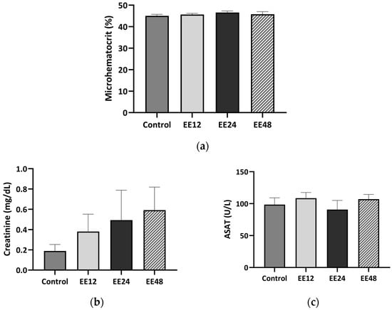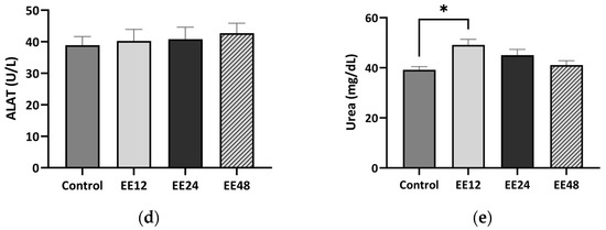 The microhematocrit values per animal group are shown in Figure 3a (Supplementary Table S1), which were not significantly different between the experimental groups. Regarding the serum biochemical parameters (Figure 3c–e), there were no significant differences between the groups, except for the urea values (Figure 3e) in the control group and EE12 (p = 0.011).