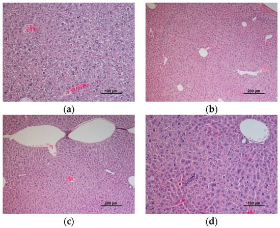 Microscopic images (staining with H&E) of liver sections from the different groups under study. (a) Cellular tumefaction and hydropic changes in a mouse’s liver from the control group, 200×. (b) Hydropic changes observable only in the centrilobular region of an animal’s liver from EE12, 100×. (c) Cellular tumefaction and centrilobular hydropic changes in a mouse’s liver from EE24, 100×. (d) Cellular tumefaction, centrilobular hydropic changes, and multifocal inflammatory infiltration in an animal from EE48, 200×.