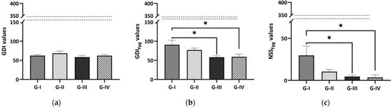 Genetic damage index values (mean ± SE and expressed as arbitrary units) determined by the comet assay, corresponding to untreated slides (a) and slides treated (b) with Fpg and the resulting NSSFpg (c). * Statistically significant differences (p < 0.05).