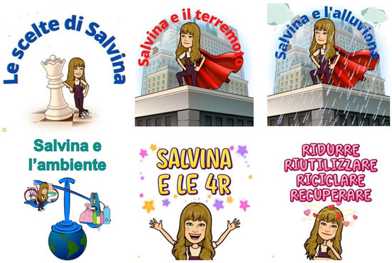 In particular, four adventures of Salvina have been created: Salvina and the earthquake: what will she do? (Salvina e il terremoto: cosa farà?), Salvina and the flood: what will she do? (Salvina e l’alluvione: cosa farà?), Salvina and the environment: what will she do? (Salvina e l’ambiente: cosa farà?), Salvina and the 4Rs: what will she do? (Salvina e la 4R: cosa farà?).
