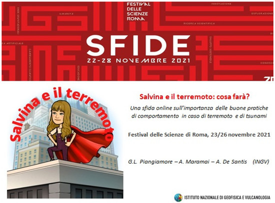 Finally, the game Salvina and the earthquake was played by 560 students from 22 classes of fourteen Primary and Middle Schools from all over Italy, in an educational lab at the Rome Science Festival from 22 to 28 November 2021. Figure 2 shows the flyer promoting the Salvina’s activity during the event.