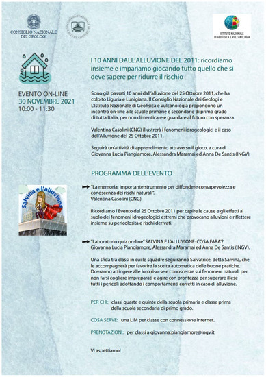 The game Salvina and the flood: what will she do? was designed to stimulate reflective learning about hydrogeological risk. This new adventure caught the interest of the Consiglio Nazionale dei Geologi. Therefore, an online special venue was organized for schools throughout Italy, for the comprehension of landslides and floods and for the dissemination of good practices to be adopted in the case of a flood event. Figure 3 shows the poster of the special venue where Salvina and the flood was played for the first time.