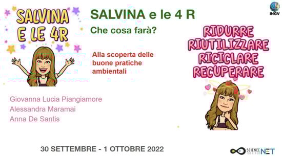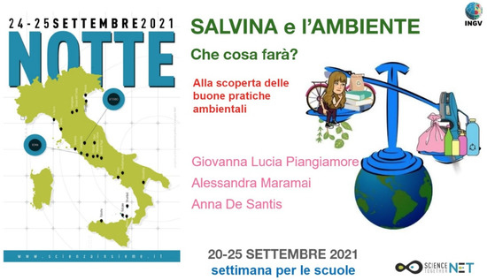 As mentioned, during the Covid19 pandemic, it was necessary to find new modalities to keep the important School/Research relationship active, despite the inability to be physically in the classroom to carry out scientific events. In order to connect electronically with students to cope with isolation, we devised the character of Salvina, a little girl they could identify with. So, we developed a set of five educational games having Salvina as the protagonist: she has to face different dangerous situations due to the occurrence of natural phenomena and she has to choose good practices to adopt on a daily basis to respect the environment. Indeed, Salvina, whose name is a synonym for rescuer, is capable of saving herself, others, and our planet. These games allowed to involve simultaneously about 8200 students located all over Italy in a compelling challenge, reaching an impressive number of people with a participative approach and at the same time to better face distancing and reduced social contact.